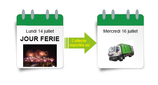 Lorsque le jour de collecte de votre bac à ordures ménagères est un jour férié, la collecte est donc reportée (ou avancée) au mercredi.