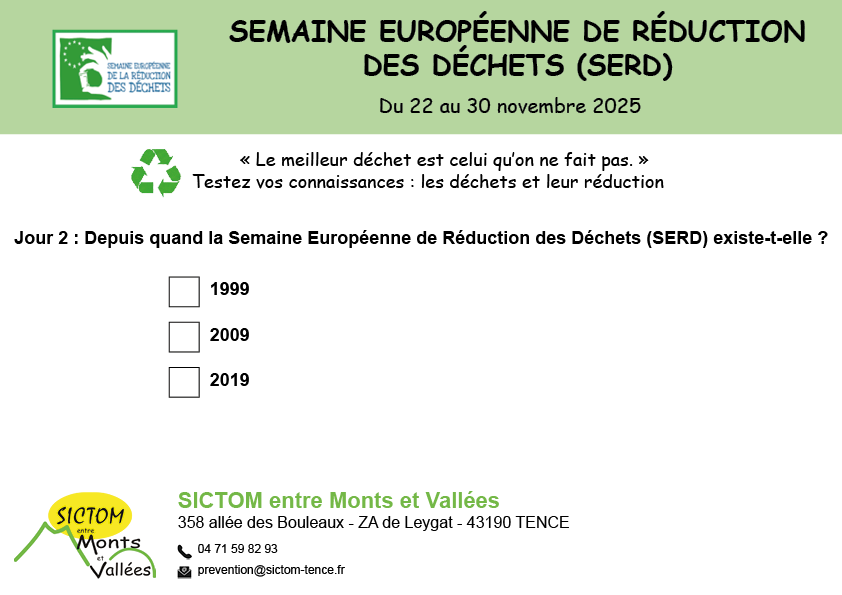 Quizz - Question 2 : SERD 11/23/25 Testez vos connaissances sur les déchets : Question 2/9 : Rendez-vous demain à 9h pour la réponse. Source : SICTOM entre Monts et Vallées