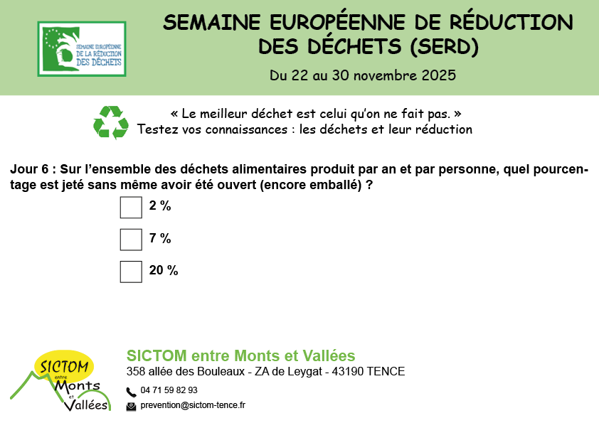 Quizz - Question 6 : SERD 11/27/25 Testez vos connaissances sur les déchets : Question 6/9 : Rendez-vous demain à 9h pour la réponse. Source : SICTOM entre Monts et Vallées