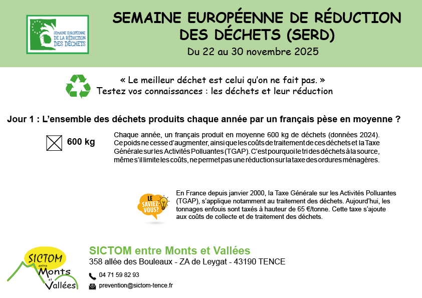 Quizz - Réponse 1 : SERD 11/23/25 Testez vos connaissances sur les déchets : Réponse 1/9 : Visionnez cette courte vidéo de l’ADEME de 2010 (31 secondes) en cliquant ici. Rendez-vous à 12h pour une nouvelle question. Source : SICTOM entre Monts et Vallées