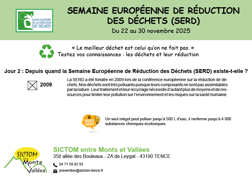 Quizz - Réponse 2 : SERD 11/24/25 Testez vos connaissances sur les déchets : Réponse 2/9 : Trois bons réflexes pour les fumeurs sur ce lien Rendez-vous à 12h pour une nouvelle question. Source : SICTOM entre Monts et Vallées