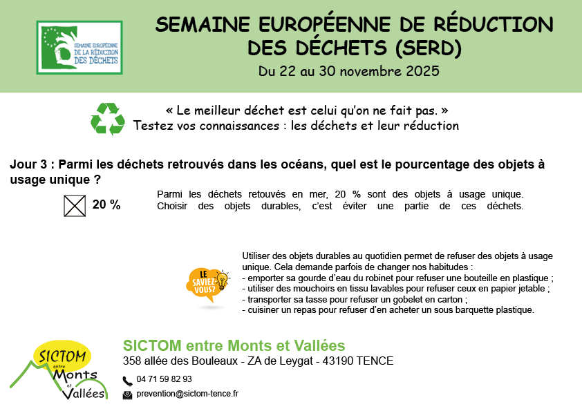 Quizz - Réponse 3 : SERD 11/25/25 Testez vos connaissances sur les déchets : Réponse 3/9 : Visionnez cette vidéo du Ministère pour la Transition Écologique de 2014 (2 minutes 47 secondes) en cliquant ici Rendez-vous à 12h pour une nouvelle question. Source : SICTOM entre Monts et Vallées