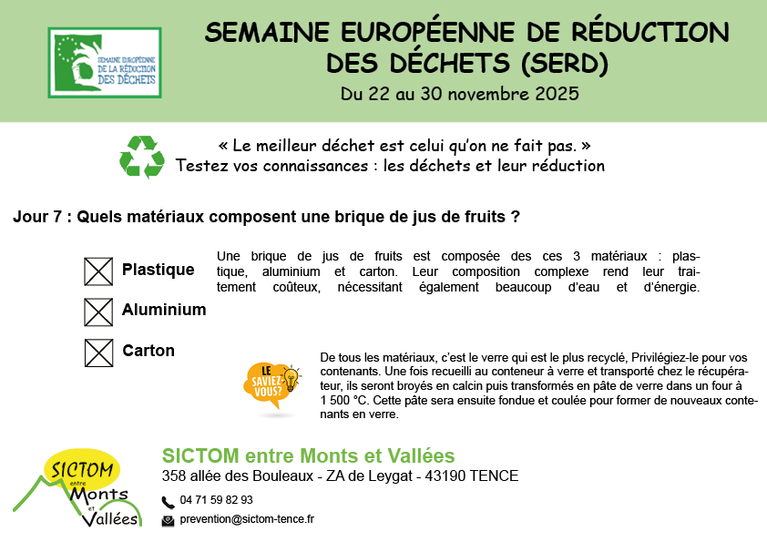 Quizz - Réponse 7 : SERD 11/29/25 Testez vos connaissances sur les déchets : Réponse 7/9 : Ecoutez le podcast "Comment réduire le plastique dans nos vies ?" (1 minutes 50 secondes) en cliquant ici Rendez-vous à 12h pour une nouvelle question. Source : SICTOM entre Monts et Vallées