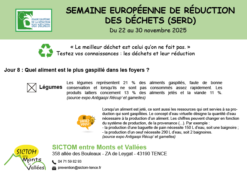 Quizz - Réponse 8 : SERD 11/30/25 Testez vos connaissances sur les déchets : Réponse 8/9 : Visionnez cette courte vidéo de l'ADEME de 2010 (31 secondes) en cliquant ici Rendez-vous à 12h pour une nouvelle question. Source : SICTOM entre Monts et Vallées