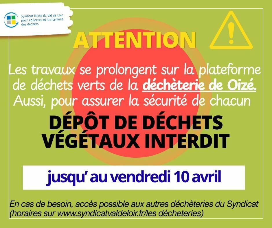 ⚠  Les travaux n'étant pas terminés sur la plateforme des déchets verts de la déchèterie de Oizé, l'interdiction de dépôt de déchets végétaux est prolongée jusqu'au :
