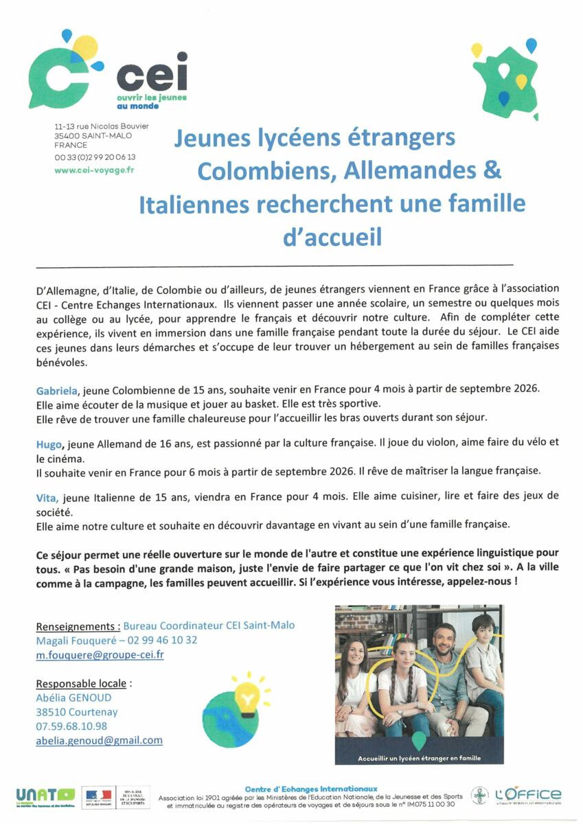 Le Centre d’Échanges Internationaux est une association loi 1901 recherchant des familles d’accueil bénévoles pour des jeunes étrangers désireux de perfectionner leurs connaissances de la langue et de la culture française. Pendant toute la durée de leur séjour, ils seront hébergés en famille et scolarisés au lycée le plus proche de leur lieu d’hébergement.