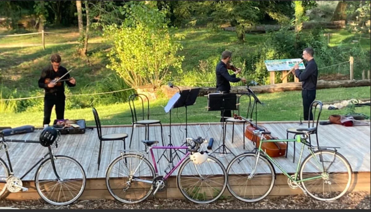 “Concerts en roues libres” du 5 au 11/06/25, c’est un quatuor de musiciens professionnels qui parcourent en 7 étapes l’Ardèche à vélo, instruments sur “le dos”.