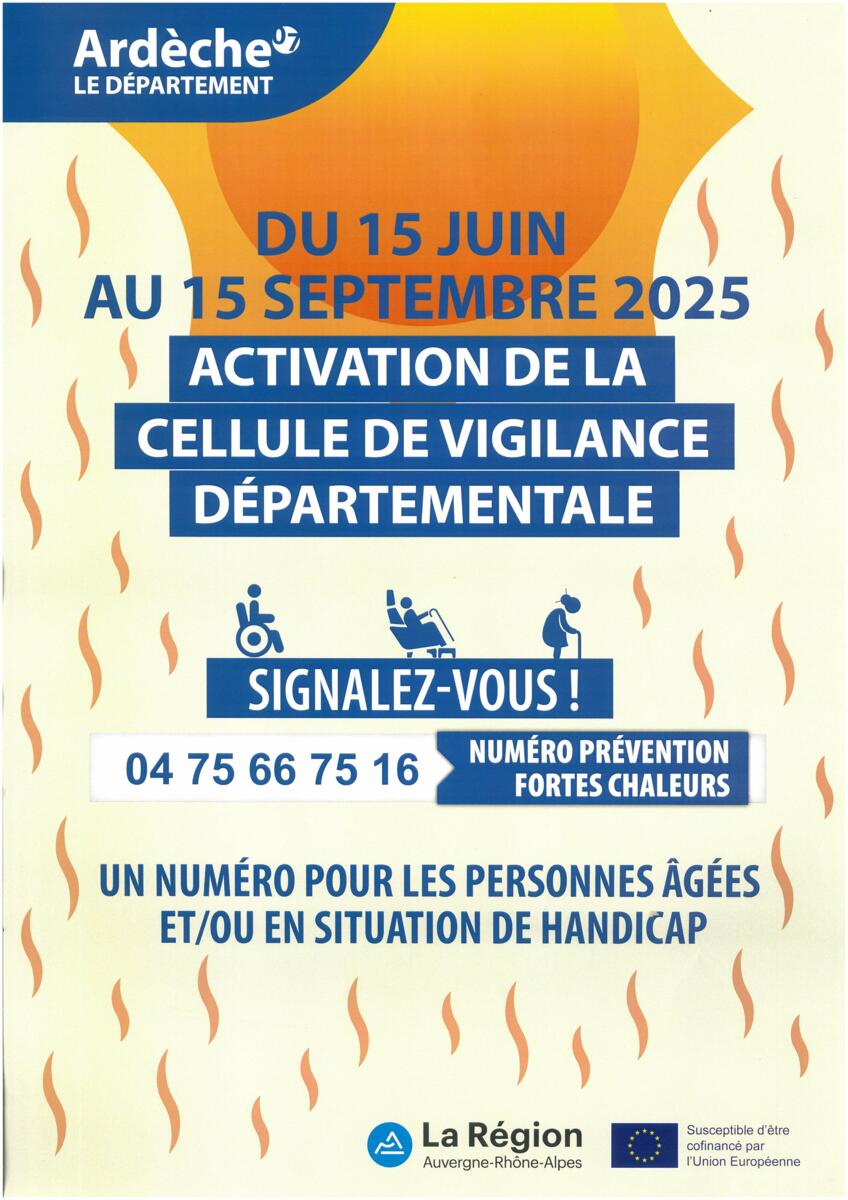 Météo France a placé l'Ardèche en vigilance ORANGE canicule à partir du samedi 28 juin 12H00 jusqu'à mardi ou mercredi prochain.