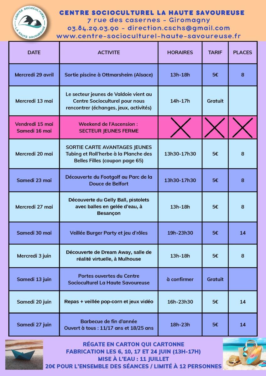 👉 D’avril à juin, le secteur jeunes du Centre Socioculturel La Haute Savoureuse t’embarque dans une ambiance fun et dynamique : sorties, activités sportives, projets créatifs et moments entre potes !