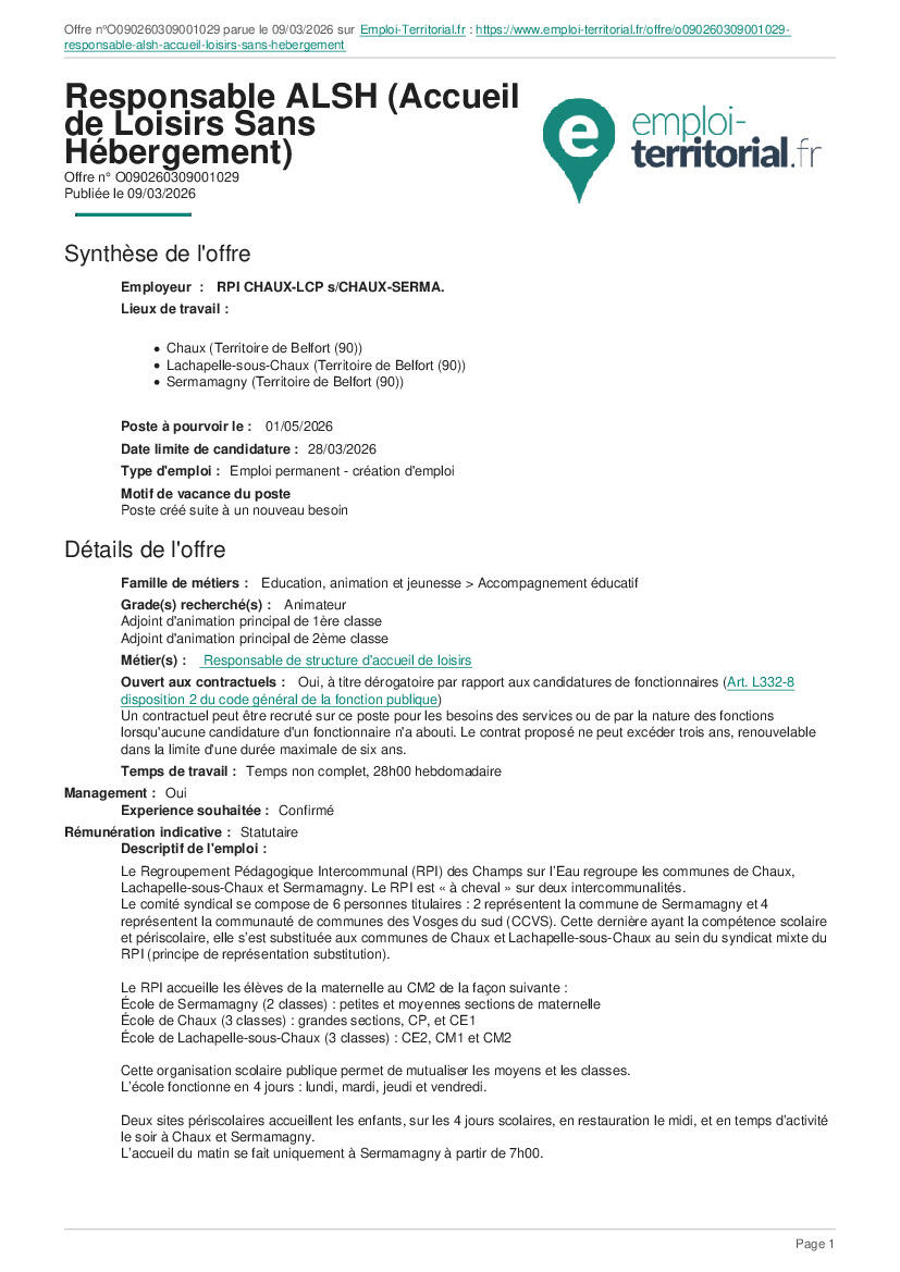 Le Regroupement Pédagogique Intercommunal des Champs sur l'Eau (Chaux, Sermamagny et Lachapelle-sous-Chaux) recherche un(e) Responsable d’Animation pour son site périscolaire / ALSH.