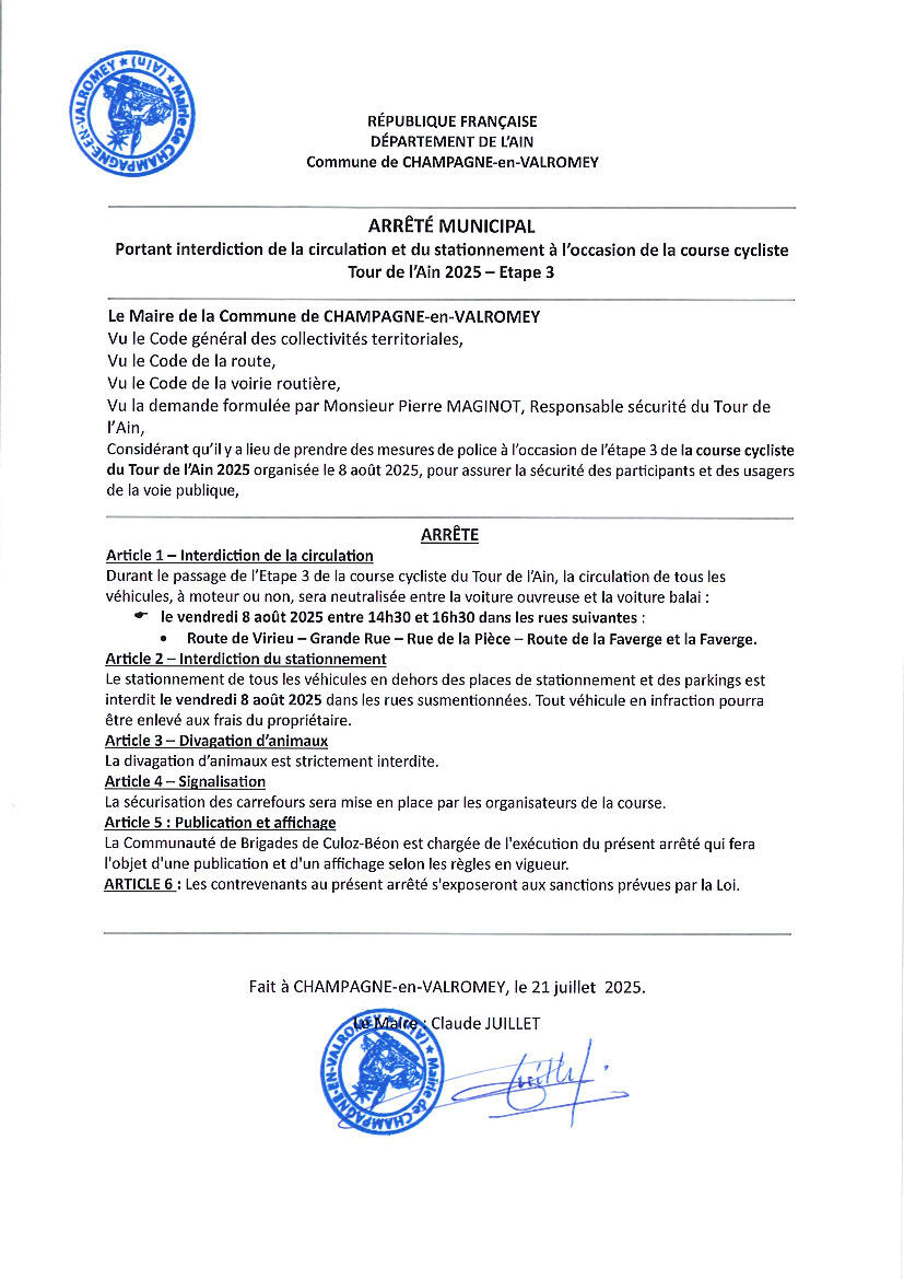 Su ayuntamiento / Noticias / Arrêté de circulation Tour de l'Ain 08/08