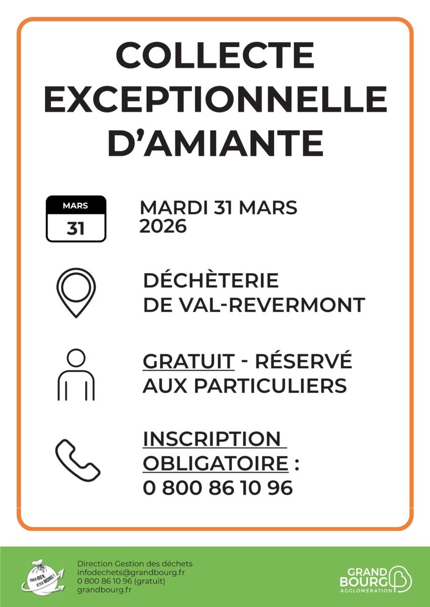 Collecte exceptionnelle amiante 31/03 19/3/26 Déchetterie Val-Revermont Inscription obligatoire 0800 86 10 96
