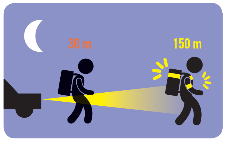La solution est d’équiper les habits et le cartable de votre enfant de bandes ou stickers rétroréfléchissants qui renvoient vers les conducteurs la lumière de leurs phares. Ces dispositifs rendent un piéton visible à plus de 150 mètres, soit 5 fois plus qu’en temps normal.