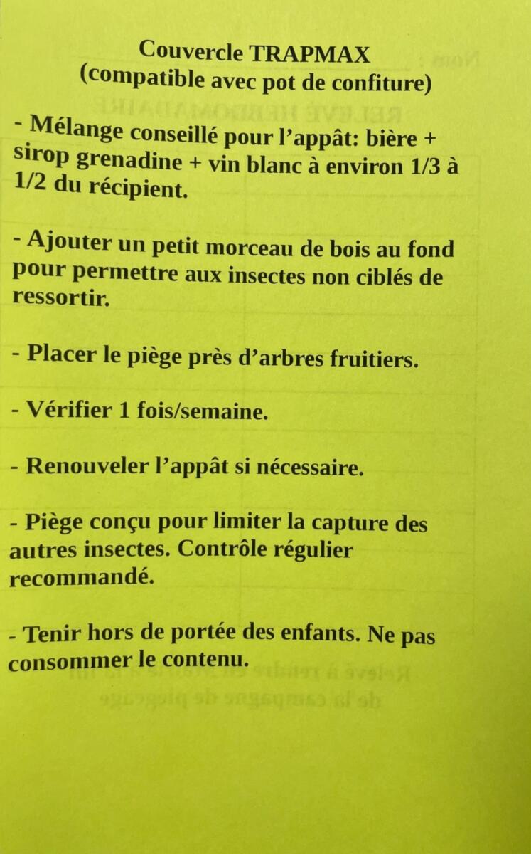 Afin de renforcer cette campagne de piégeage, il vous est possible de venir récupérer en Mairie un dispositif  qui s'adapte sur un couvercle de pot de confiture (voir photo).