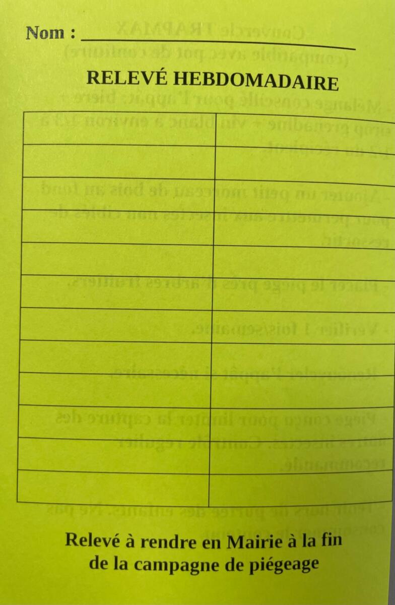 Ce dispositif vous sera prêté et est accompagné d'une notice et d'un tableau de suivi/comptage hebdomadaire (voir photos) que vous devrez rendre fin mai en Mairie.