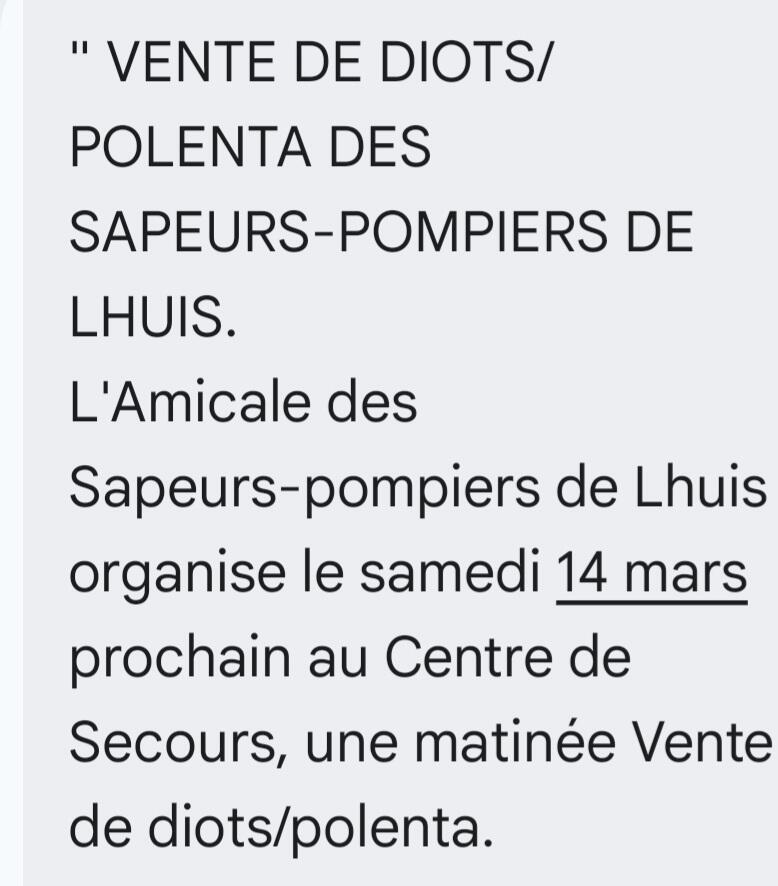 SAPEURS-POMPIERS LHUIS 20/2/26 Vente de Diots/Polenta. Réservation fortement conseillée au 07 83 37 34 37.