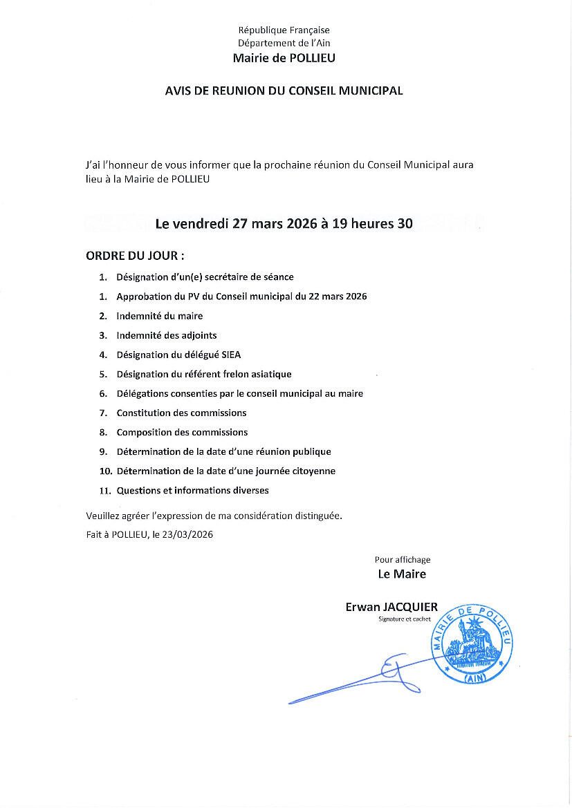 Vous trouverez ci-dessous l'avis de réunion du prochain conseil municipal.