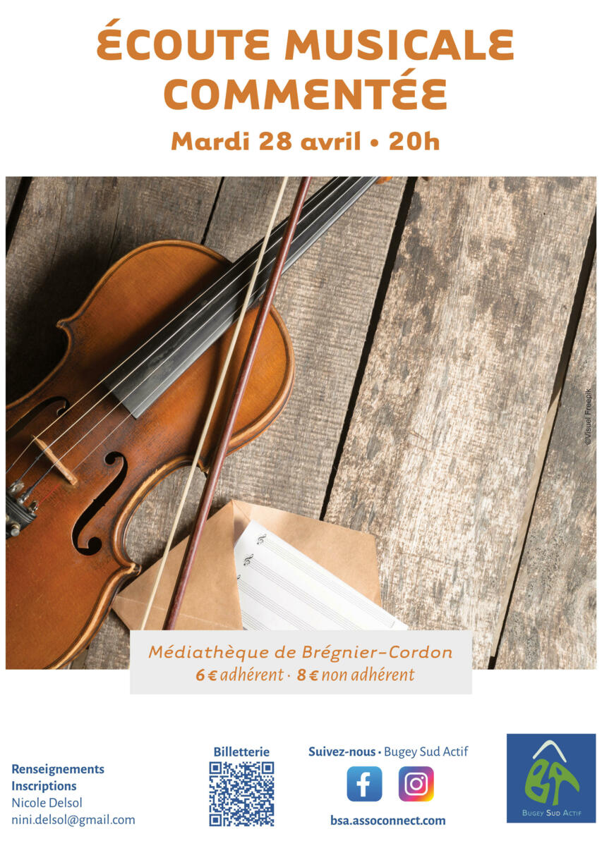 BSA vous propose le 28 avril à la médiathèque municipale de Brégnier-Cordon, à 20 h, une écoute musicale commentée, très intéressante, sur un sujet qui sera dévoilé le soir même