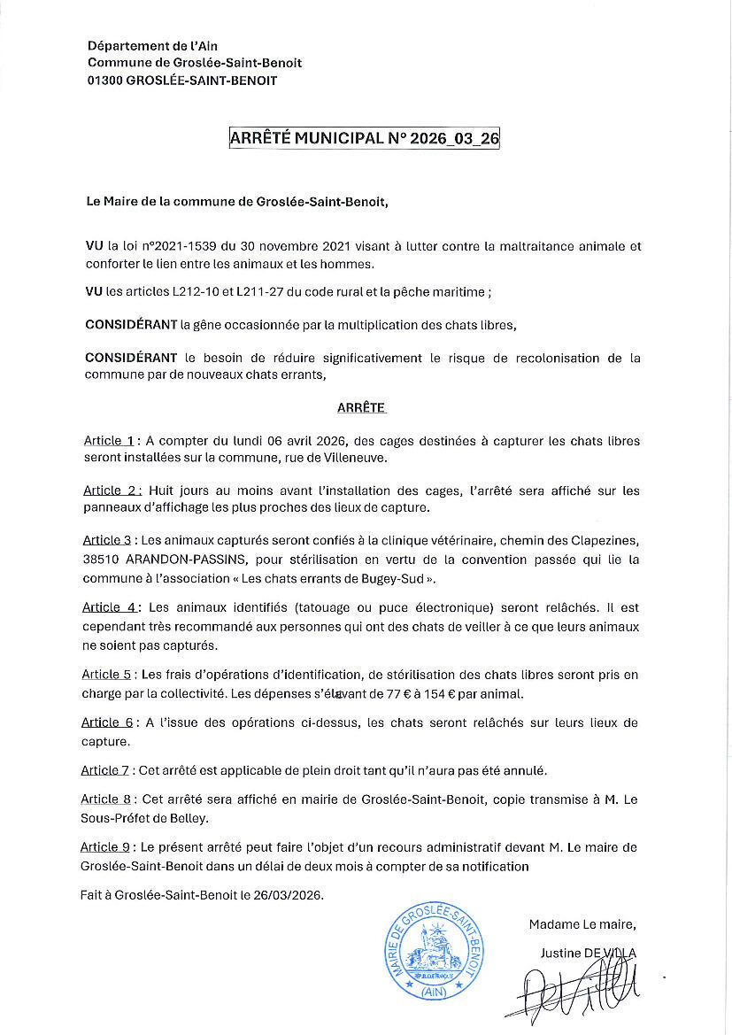 Dans le cadre d’un arrêté municipal pris ce jour, nous vous informons que la pose de cages de capture pour chats sera mise en place à compter du 6 avril 2026, rue de Villeneuve.