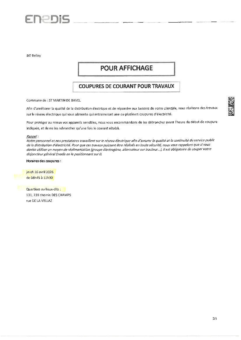 COUPURE DE COURANT LE 16 AVRIL 2/4/26 Merci de bien vouloir prendre note de l'information ENEDIS COUPURES DE COURANT POUR TRAVAUX LE JEUDI 16 AVRIL 2026 DE 08H45 A 11H30 Voir pièce jointe Source : Mairie de Saint-Martin-de-Bavel