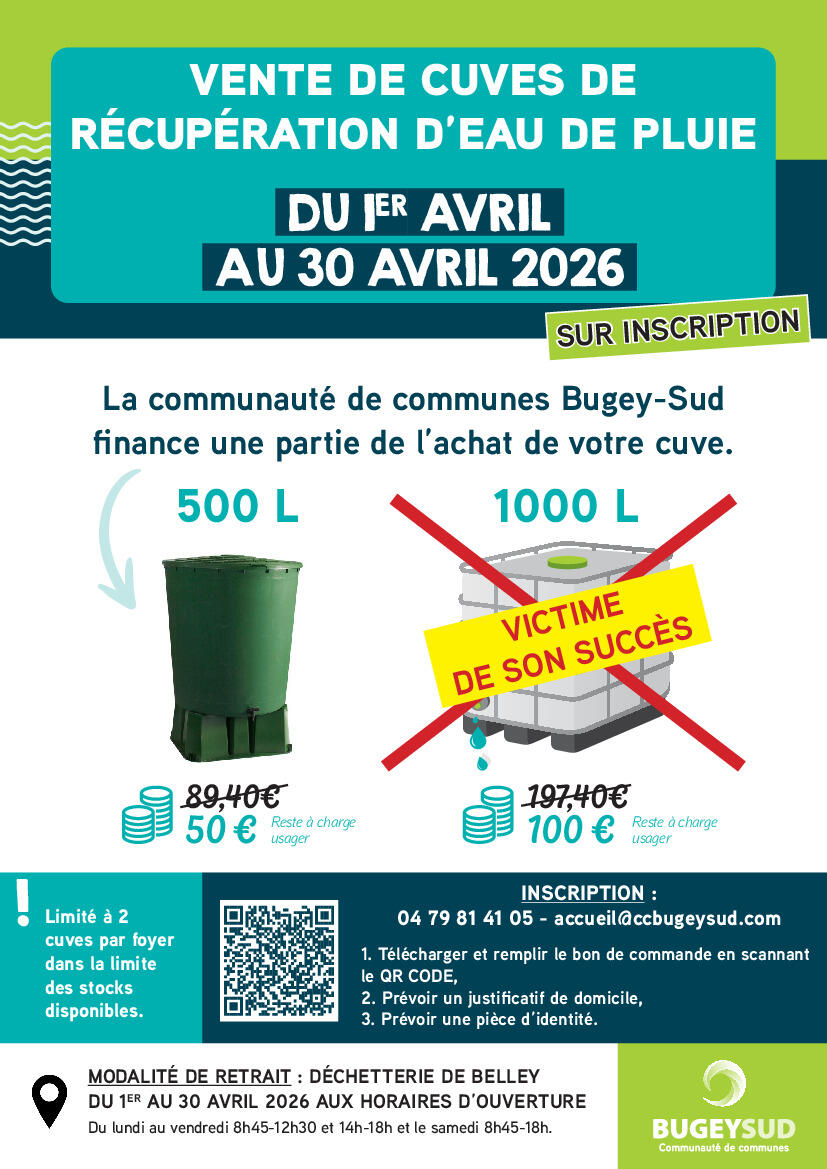 Le bon de commande est accessible via le QR code présent sur l’affiche ou directement en ligne : https://ccbugeysud.com/actualites/vente-de-cuves-de-recuperation-deau-de-pluie-au-mois-davril-2026