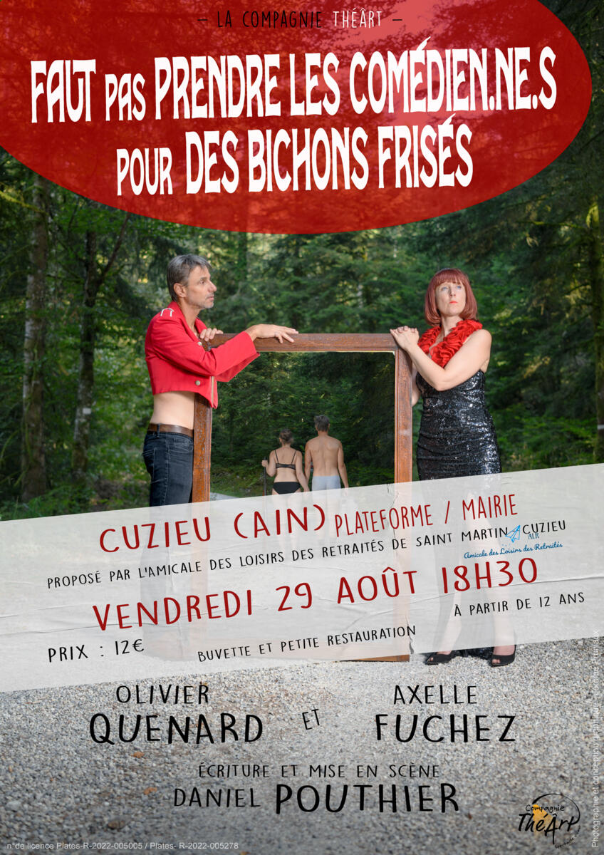 L'amicale des loisirs des retraités Saint Martin Cuzieu vous proposent une soirée théâtrale le vendredi 29 aout à 18h30 plateforme de Cuzieu avec la pièce "faut pas prendre les comédiennes pour des bichons frisés". Buvette et petite restauration. Venez nombreux !