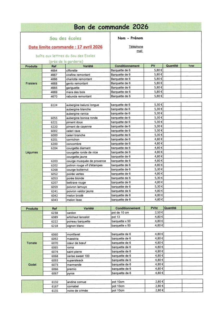 🗓️ Les commandes sont ouvertes jusqu'au 17 avril 2026 et doivent être déposées dans la boîte aux lettres du Sou avec le règlement.