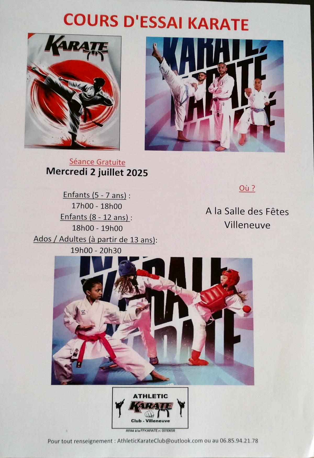 ATHLETIC KARATE CLUB 28/6/25 Cours d'essai gratuit de Karaté à partir de 5 ans le Mercredi 2 juillet Source : Mairie de Villeneuve