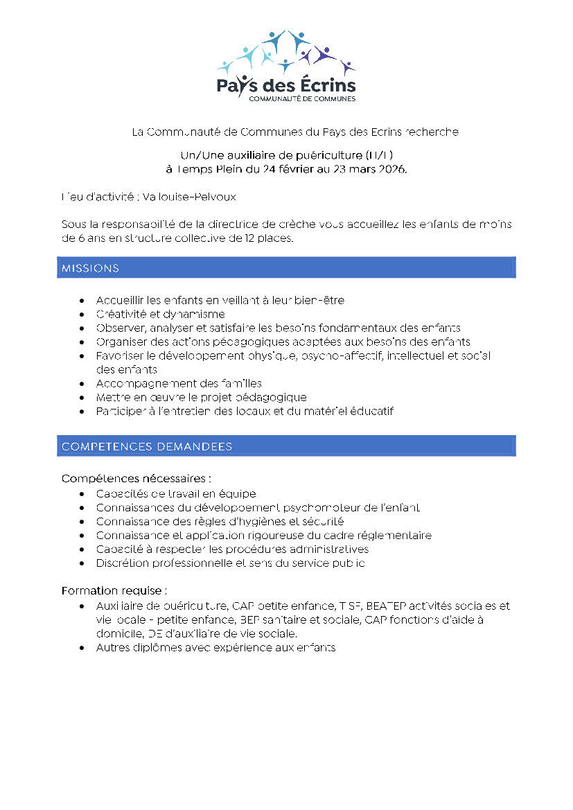 Su ayuntamiento / Noticias / Offre d'emploi "Crèche les Eterlous" Vallouise-Pelvoux