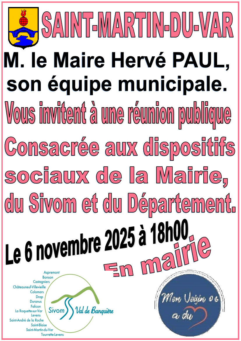 Monsieur le Maire et son équipe municipale vous invitent à une réunion publique consacrée aux dispositifs sociaux mis en place par la Mairie, le Sivom du Val de Banquière et le Département.