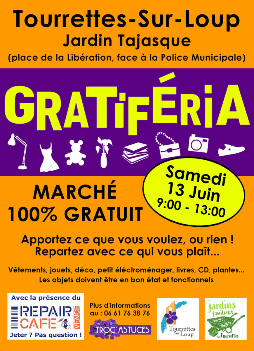 La Gratiféria se déroulera au Jardin Tajasque (face à la Police Municipale, sur la place de la Libération). Venez nombreux !