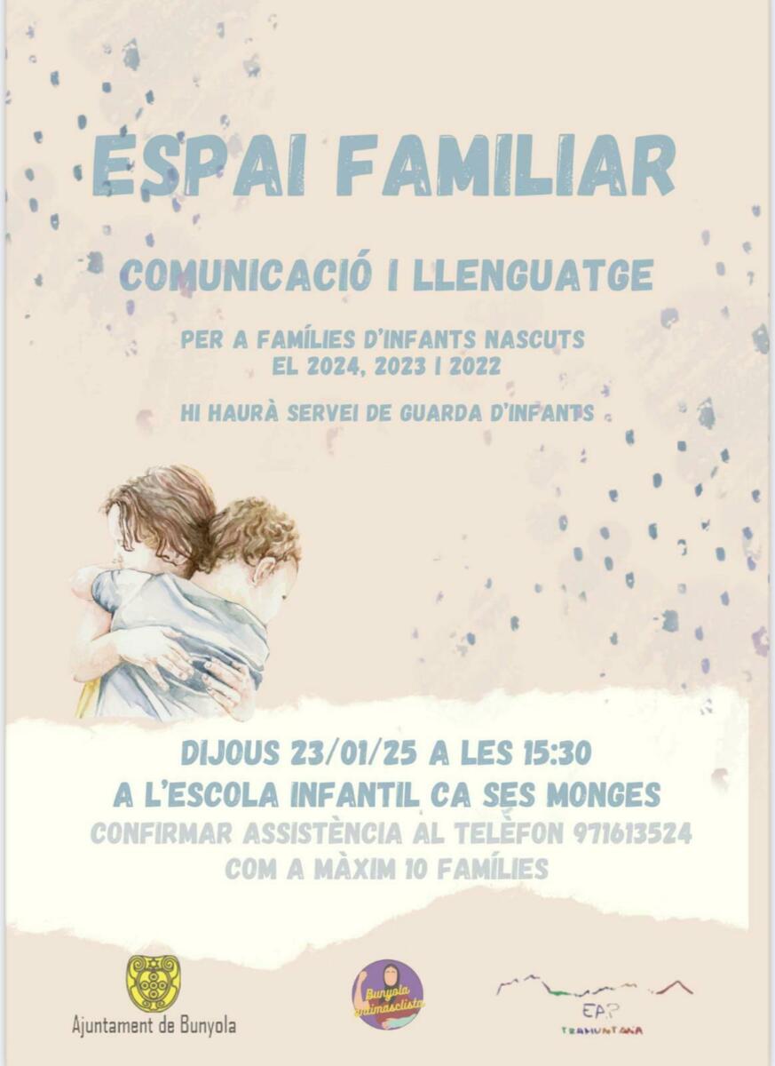 El proper dijous dia 23 de gener a les 15:30h a l'Escola Infantil de Ca Ses Monges. Es tractarà sobre "Comunicació i Llenguatge" Si teniu infants nascuts entre el 2022 i 2024, no us ho podeu perdre. És important confirmar assistència al telèfon 971-613524.