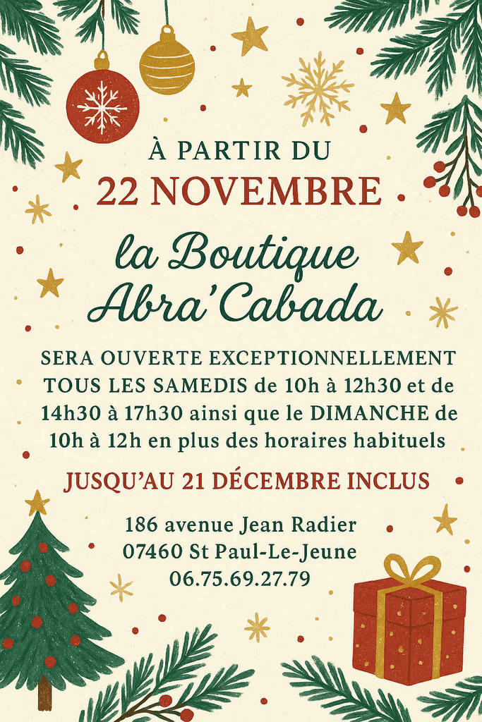 Abracabada ️ sera ouverte exceptionnellement tous les Samedi de 10h à 12h30 et de 14h30 à 17h30 ainsi que le Dimanche de 10h à 12h en plus des horaires habituels et ce jusqu'au 21 Décembre inclus afin de palier aux préparations de fêtes de fin d'années