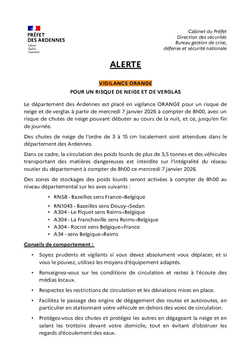 Météo France vient de placer le département des Ardennes en vigilance ORANGE pour Neige et verglas