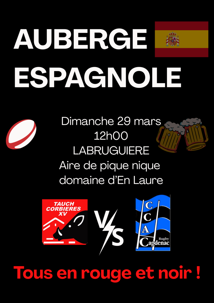 🚨Auberge espagnole organisée le Dimanche 29/03 à 12h00 LABRUGUIERE à l'Aire de pique nique domaine d'en Laure pour la rencontre COTC TAUCH CORBIERES XV contre CCAC Rugby Capdenac.