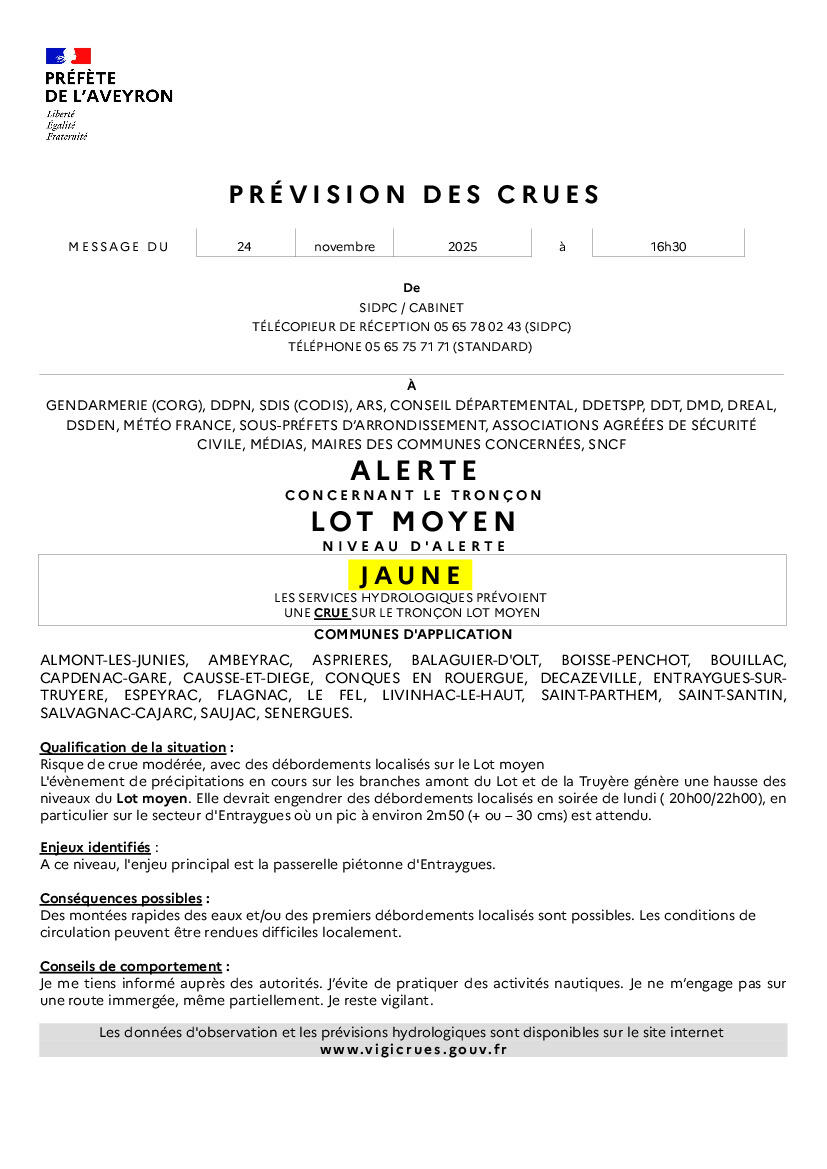 Ci-joint l'alerte de la préfecture concernant des crues éventuelles sur le Lot moyen.