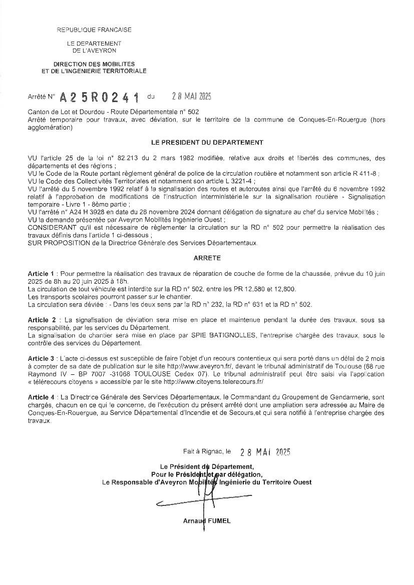 Veuillez trouver ci-joint l'arrêté temporaire de circulation sur la D 502 Saint-Cyprien & Noailhac, du 10Juin au 20 Juin.