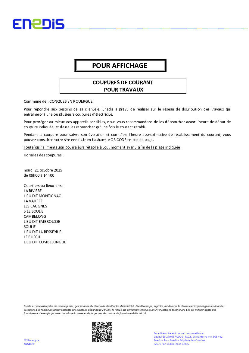 Une coupure est prévue le 21 octobre de 9h00 à 14h00. Ci-joint les lieux-dits concernés.