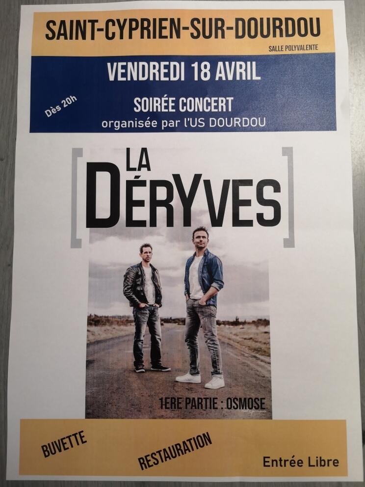 L'US Dourdou organise un concert le vendredi 18 avril dès 20h00 avec le groupe La Déryves.