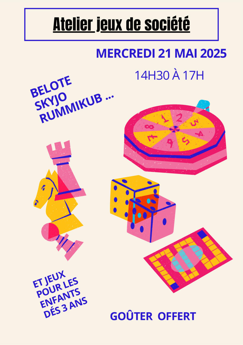 L'équipe des bénévoles vous convie le mercredi 21 Mai 2025 à 14H30 à la bibliothèque de Sénergues. Un atelier gratuit «jeux de société» destiné à tous les âges dès 3ans sera proposé.