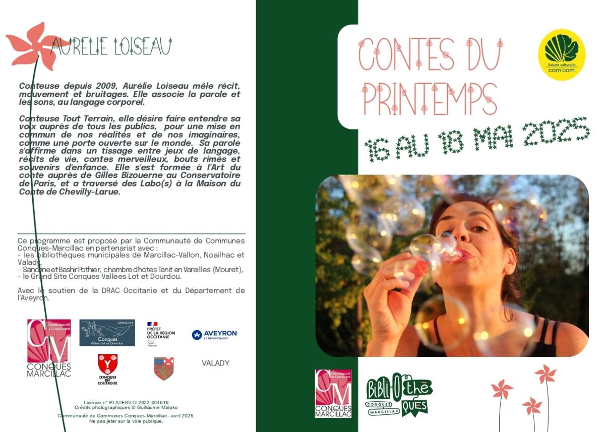 Veuillez trouver ci-joint le programme des « Contes du printemps », un programme proposé par la Communauté de Communes en partenariat avec le réseau des Bibliothèques Conques-Marcillac, le Grand site Conques Vallées Lot et Dourdou, la chambre d’hôte Tanit en Vareilles et l’association Les Amis de Pruines.