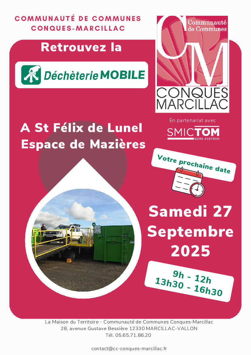 Nous vous informons que la prochaine déchèterie mobile aura lieu le samedi 27 Septembre 2025 à St Félix de Lunel, à Mazières.