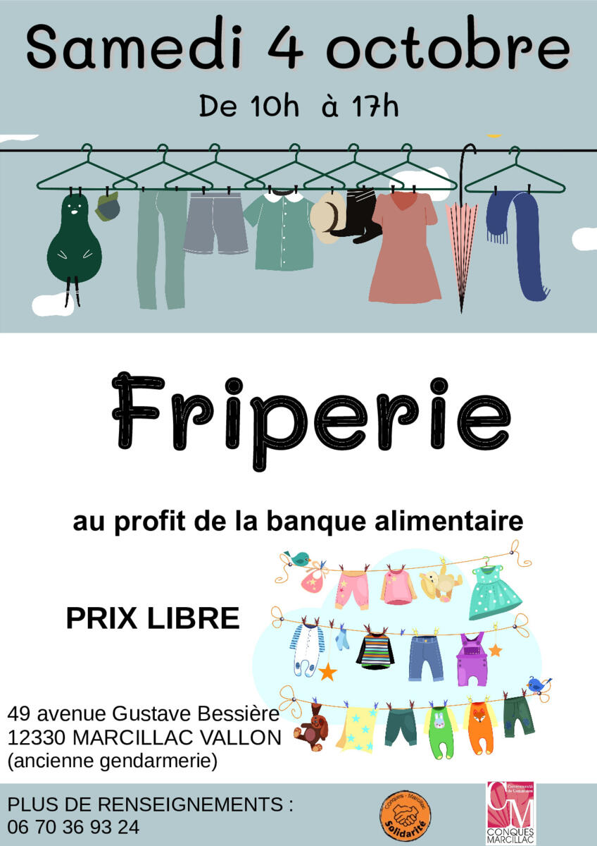 Conques Marcillac Solidarité organise une grande friperie dans et devant ses locaux au 49 avenue Gustave Bessière à Marcillac, le samedi 4 Octobre 2025, de 10h à 17h.