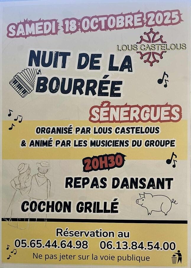 Le groupe folklorique Lous Castelous de Sénergues est heureux de vous convier à une nouvelle édition de leur traditionnelle Nuit de la Bourrée qui aura lieu samedi 18 octobre à partir de 20 h 30 à la salle des fêtes de Sénergues.