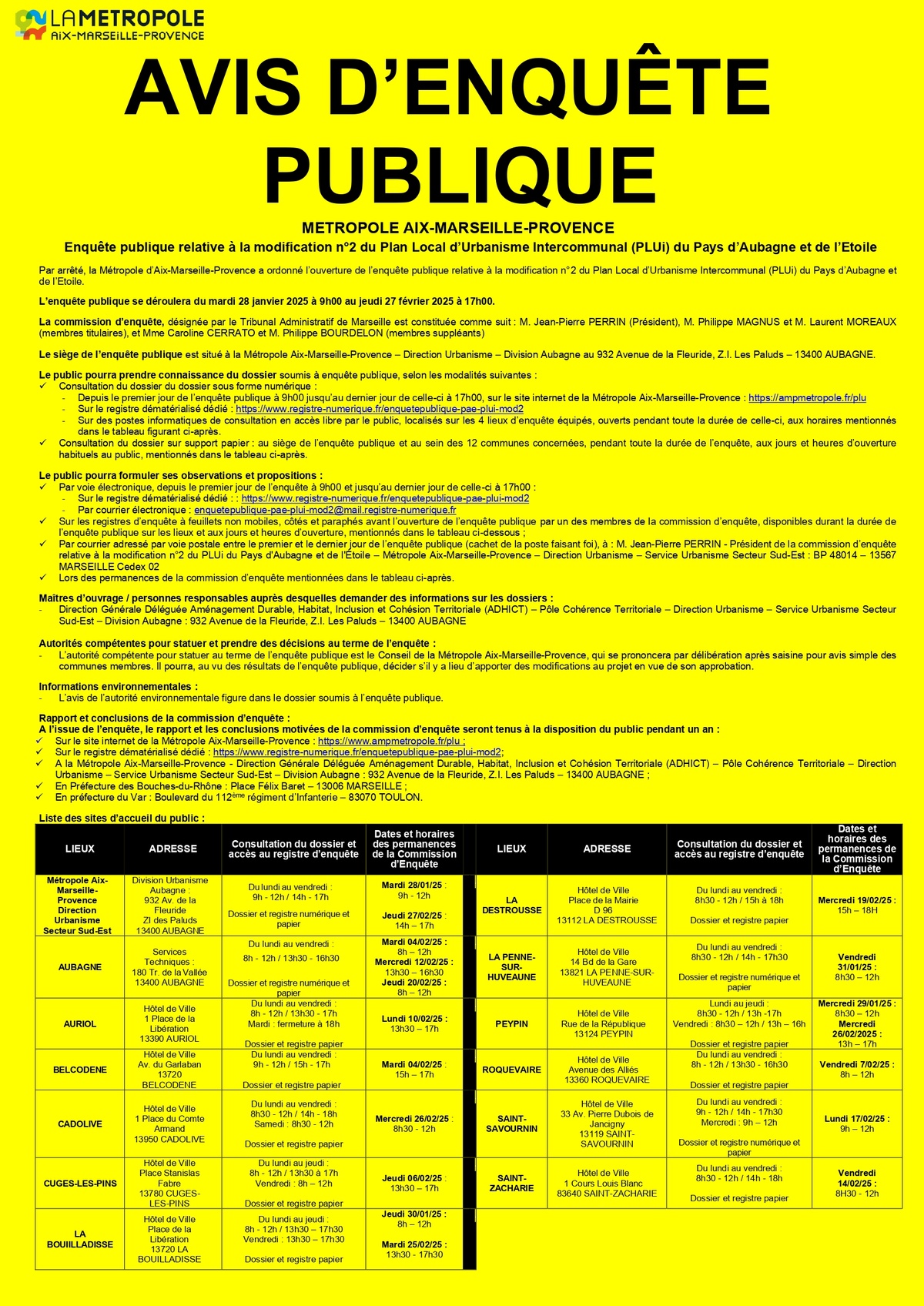 La Métropole procédera à une enquête publique portant sur le projet de modification n°2 du Plan Local d’Urbanisme intercommunal (PLUi) du Pays d'Aubagne et de l'Étoile du 28 janvier 2025 à 9h00 au 27 février 2025 à 17h00.