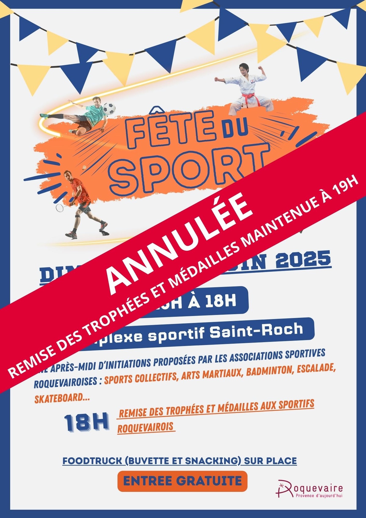 En raison des conditions météorologiques exceptionnelles annoncées ce dimanche 29 juin (canicule 🌡️), nous vous informons que nous sommes dans l'obligation d'annuler la Fête du Sport. La remise des trophées et médailles aux sportifs roquevairois est maintenue, mais elle est décalée à 19h.