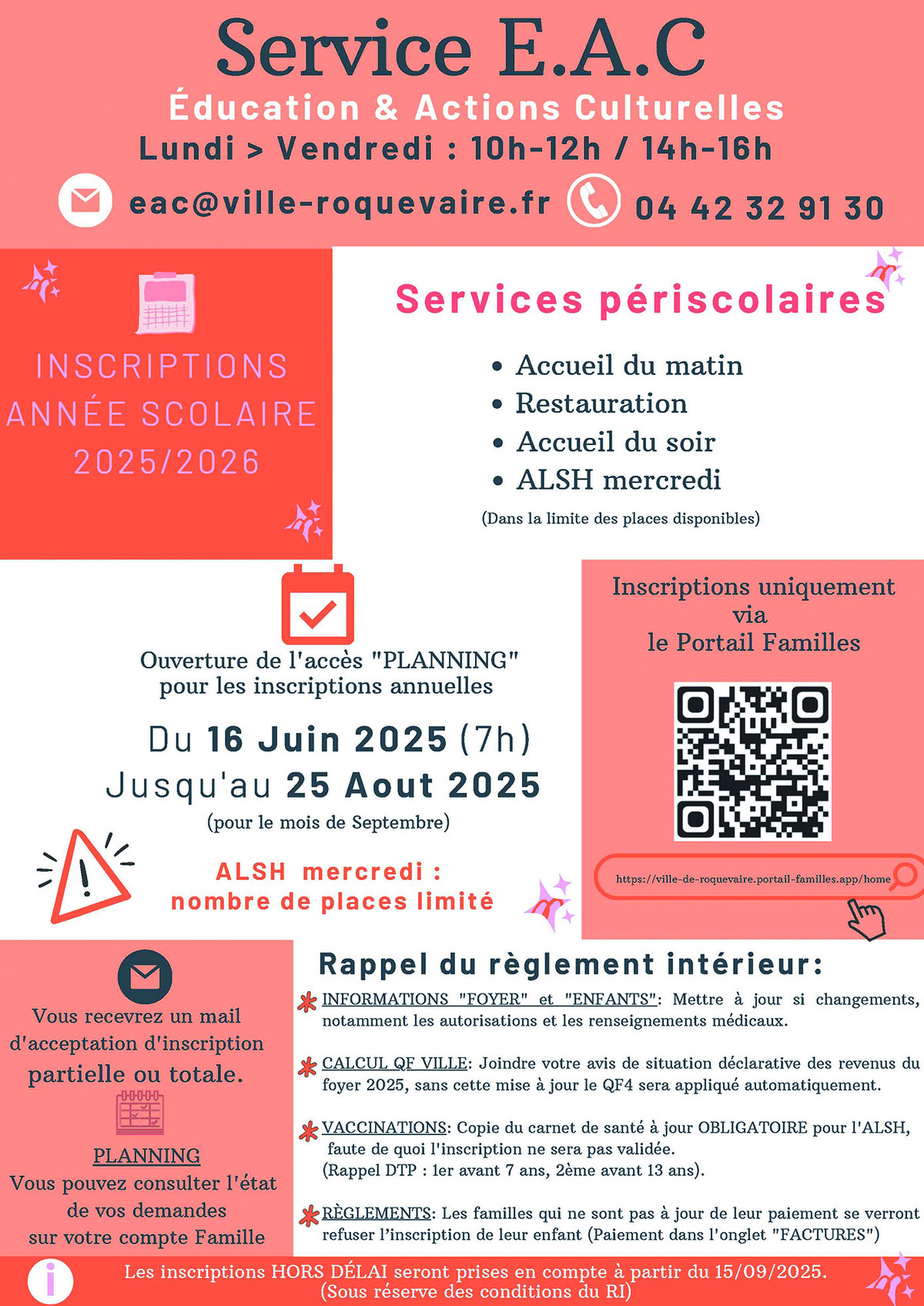 📅 Les inscriptions pour la rentrée 2025 se déroulent ce lundi 16 juin (7h) au lundi 25 août, UNIQUEMENT sur le planning de votre PORTAIL FAMILLES !
