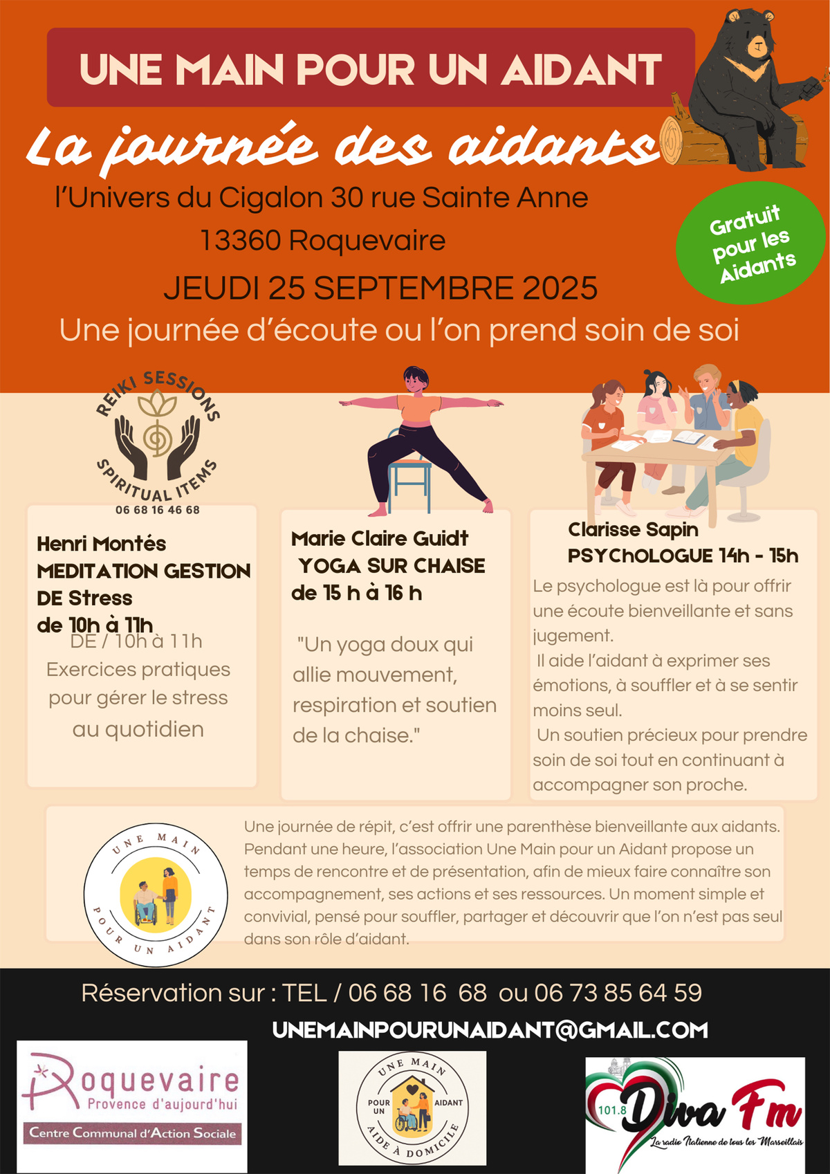 Le CCAS, en partenariat avec l’association « 𝑼𝒏𝒆 𝒎𝒂𝒊𝒏 𝒑𝒐𝒖𝒓 𝒖𝒏 𝒂𝒊𝒅𝒂𝒏𝒕 », vous propose une journée placée sous le signe du bien-être et de l’écoute. Une journée de répit, pensé pour souffler, partager et découvrir que l’on n’est pas seul dans son rôle d’aidant.