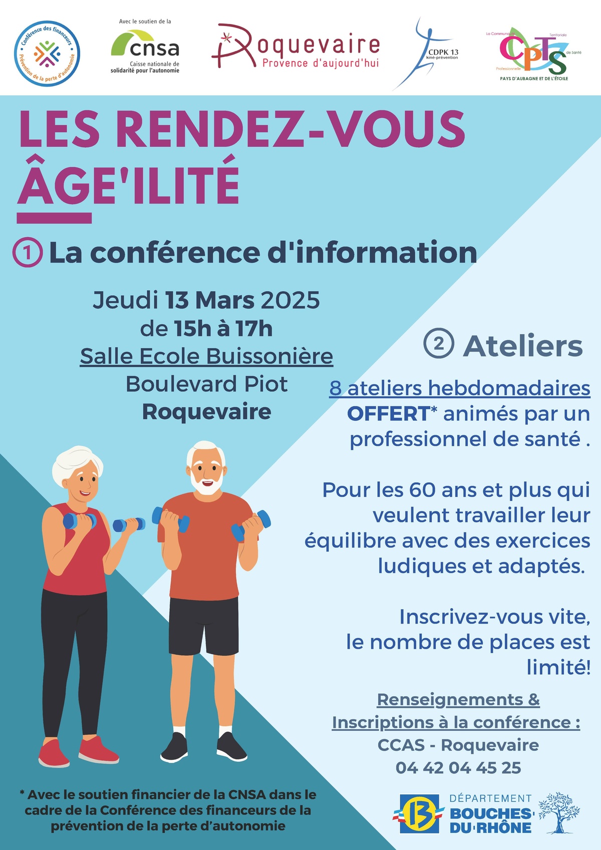 Dans le cadre de la prévention de la perte d’autonomie des Séniors, la Ville de Roquevaire et le CCAS, en partenariat avec la CPTS, la CDPK13, la Conférence des Financeurs et le soutien financier de la CNSA, organisent une conférence d’information le JEUDI 13 MARS 2025 de 15h à 17h, salle de l’Ecole Buissonnière, Bd Piot – Roquevaire.