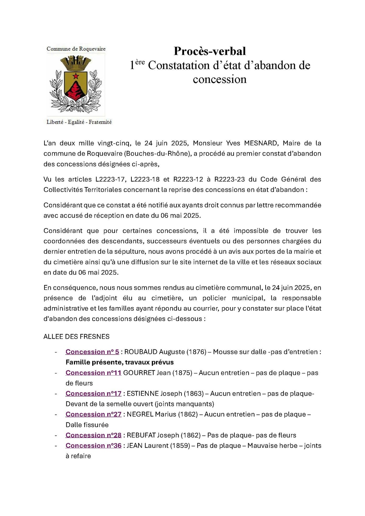 La commune de Roquevaire a procédé, le 24 juin 2025, à un constat d’abandon de concessions perpétuelles dans le cimetière communal.
